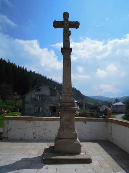 K průčelí kostelu vede schodiště, na kterém se nachází po pravé straně kamenný kříž. Kříž pochází z roku 1737 a je vyroben z hrubozrného pískovce. Po levé straně se nachází pieta sochy sedící Panny Marie s Kristem na klíně. Na zadní části sochy je letopočet 1815 a je vyrobena z jemného pískovce.