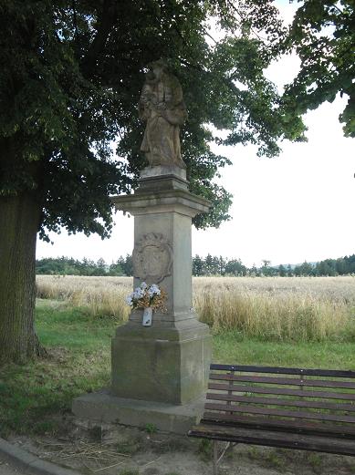 Na přední straně sochy vidíme erb Josefa rytíře Schaffenburka. Světec pravou rukou drží malého Ježíška, v levé společně se zbytkem železného kříže i jeho nožku, dítě naopak pravou rukou hladí vousy na světcových tvářích, za hlavou má Kristus kovovou svatozář, obě postavy mají kudrnaté vlasy a hlavy nakloněny směrem k sobě.