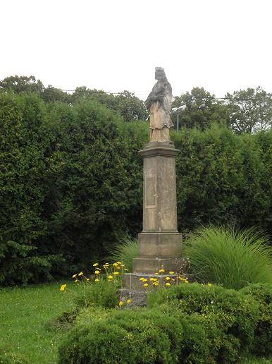 Socha sv. Jana Nepomuckého stojí v obci Pravčice před kostelem. Světec drží oběma rukamakříž, kolem hlavy má kovovou svatozář.