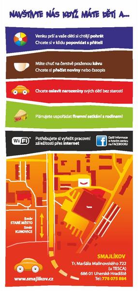 Dětské hrací centrum s kavárnou a dalšími službami zaměřené na rodiče s dětmi. Ve Smajlíkově najdete dětskou hernu, chachabox s obří skluzavkou, 2 vzduchová děla, uzavřenou skluzavku a bazén s míčky a dětský koutek pro nejmenší. Parkování u objektu zdarma, Wi-Fi.