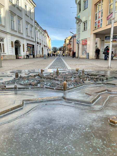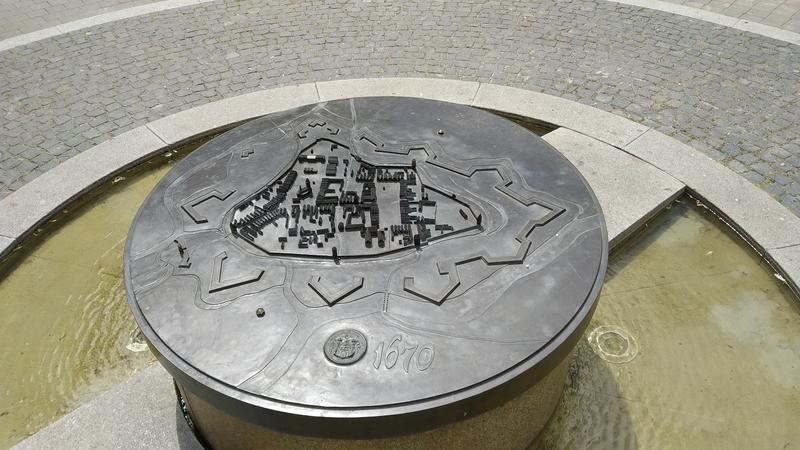 Na kruhovém kameninovém podstavci, přes jehož okraj stéká voda do mělkého bazénku, je umístěn bronzový model města Uherského Hradiště, vytvořený podle veduty z roku 1670. Přístup k němu umožňují dvě protilehlé kamenné lávky.