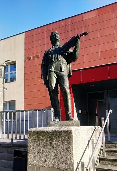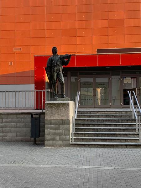 Houslista stojí před vstupem do Klubu kultury.