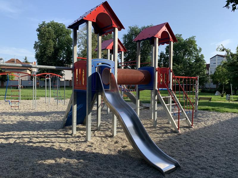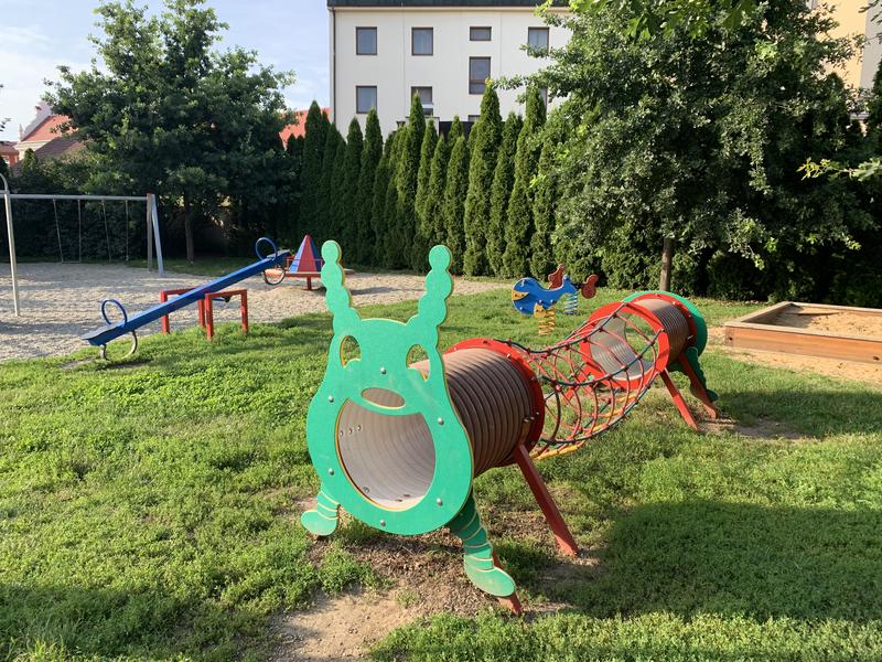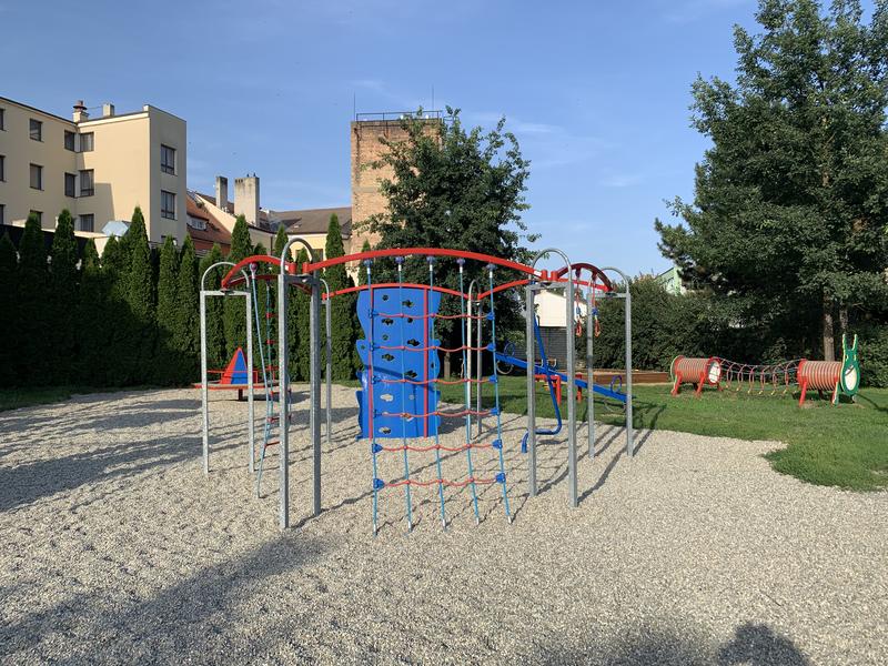 Na hřišti se nachází sestava s nerezovými skluzavkami, lanovým mostem, šplhací rampou, řetězovou houpačkou a šplhací sítí v rámu, dále šplhací sestava pro starší děti, vahadlová houpačka, kolotoč, pro menší děti prolézací tunel a dvě pružinové houpačky a pískoviště.