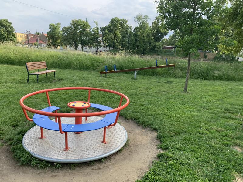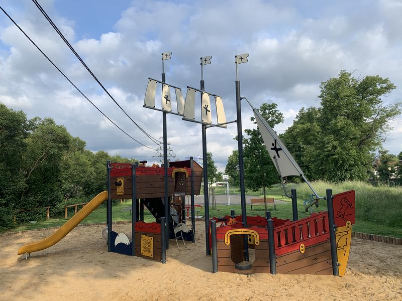 Hřiště je umístěno poblíž řeky Moravy. Dominantou je obrovská pirátská loď. Nechybí ani kolotoč nebo houpačky. Pro dospělé se zde nachází venkovní posilovací stroje - lavice, běžec, veslař a orbitrek.