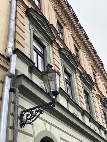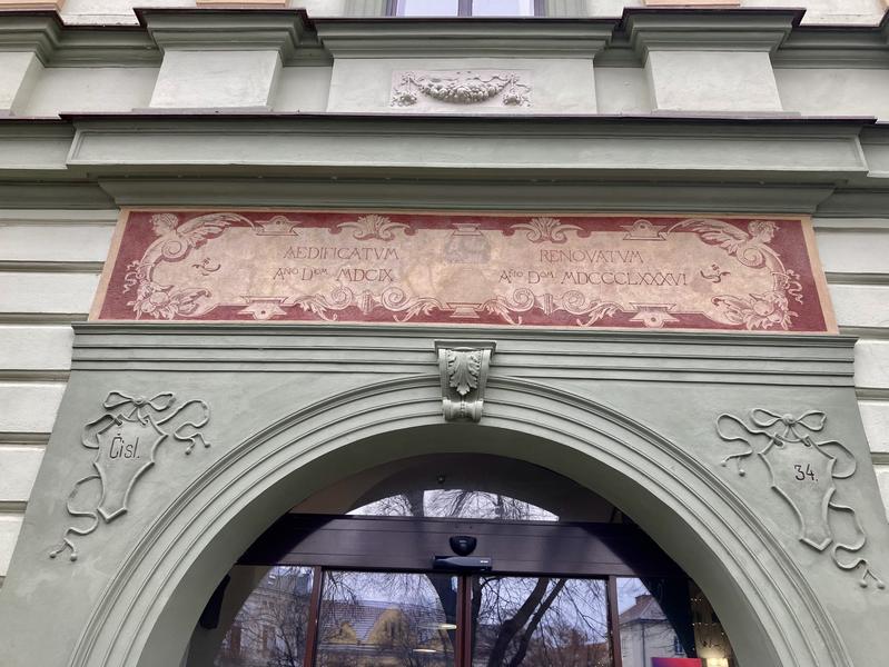 Uliční fasáda členěná vysokým pilastrovým řádem s kompizitními hlavicemi má 3+1+1 okenní osy. Pilíře v prvním patře bosované, ve druhém hladké, dvakráte přerušené průběžnými římsami mezi prvním a druhým patrem.. Okna v prvním patře rámována šambránami s ušima a nad nimi trojúhleníkové frontony. Ve druhém patře okana v jednodušší šambráně a nad nimi profilované římsy. Pod zubořesovou hlavní římsou nízká atika s festony. Vchod je rámován kamenným půlkruhovým portálem s volutovým klenákem, v rozích štuková výzdoba. Nad portálem sgrafitový pás s nápisy: vlevo aedificatum ano dom MDCIX, vpravo: renovatum ano dom MDCCCLXXXVI. V přízemí a prvním patře zachovány hřebínkové klenby.