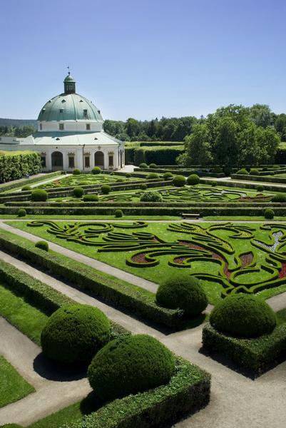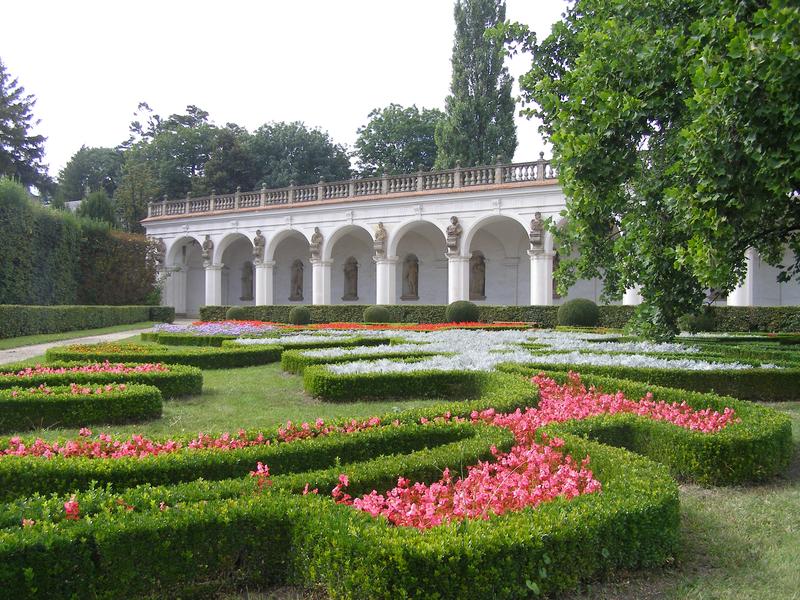Velkorysou rchitektonickou stavbou je 244 m dlouhá (původně vstupní) galerie se 44 antikou inspirovanými sochami v nikách a 46 bustami na konzolách nad pilíři arkádových oblouků. Sochařská výzdoba byla inspirována římskou vilou Pamphilia ze třetí třetiny 17. století (dnes změněné v krajinářský park). Druhým dílem byl letohrádek (rondel), dnes známý jako rotunda. Centrální stavba zahrady má osmiúhelníkový půdorys s grottami, sochami faunů a vodními hříčkami a nad středem je kupole na kruhovém tamburu, vyzdobena uvnitř freskami Carpofora Tencally, štukovou a skulpturální výzdobou Quirina Castelliho a Carla Borsy, oslavující vodu. Na ostrůvku bazénu je barokní voliéra, blízko byl králičí kopeček se sochou Diany. Unikátní jsou dochovalé kruhové zahradní kopečky, které v zahradách renesance a baroka připomínaly zahrady Mezopotámie a Říma, ale byly také součástí holandských zahrad. Přes 5,5 km je v zahradě vysokých stříhaných stěn a tisíce metrů tvarovaných buxusových plůtků a plotů i brodériových ornamentů a dva labyrinty. Architekt Arche v letech 1840–1845 nahradil původní vstup do zahrady uprostřed galerie vytvořením nového impozantního vstupu čestným dvorem, vytvořeným vstupní budovou a dvěma empirovými skleníky – Studeným a Tropickým.
