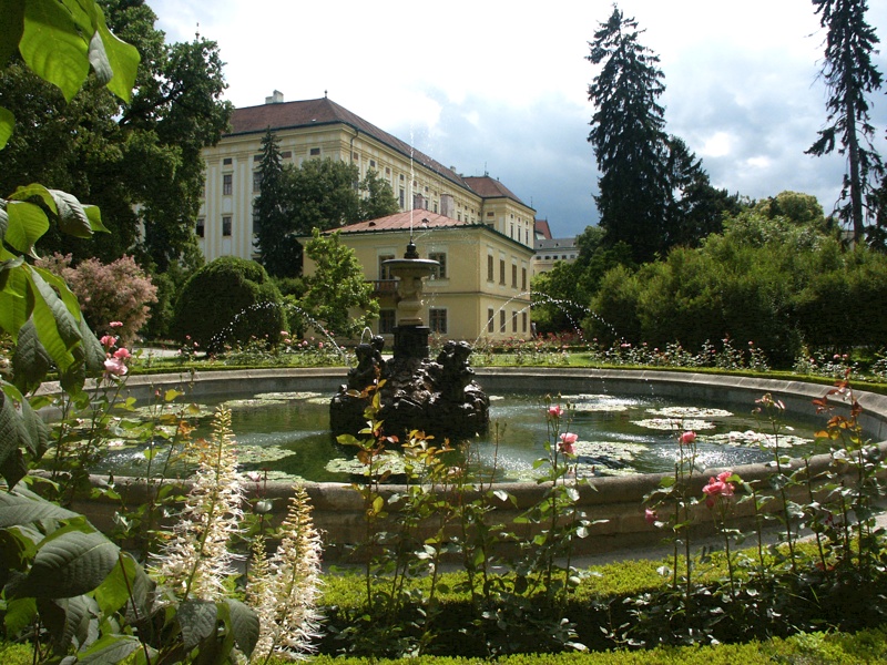 Původní užitková zahrada na bažinatém území mezi hradem a původními rameny řeky Moravy byla již v době renesance doplněna o ovocný sad a květinovou část. Slohové proměny zahrady přiváděly jakékoliv slohové změny budovy zámku. Po třicetileté válce architekt Filiberto Lucchese rozšířil její renesanční jádro ve stylu dobových salonů pod širým nebem prodloužením zámku. Osový pohled na zámek umožňoval umístění výtvarných děl, cestiček, bohaté francouzské brodérie od vodního kanálu (pozdějšího rybníka) až k sala terreně.