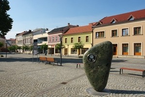 Kamenná plastika na Dolním náměstí - PLANETKA - meteorologický sloup.sochařsky pojatý objekt planetky, jejíž skutečná předloha krouží ve vesmíru pod číslem 27079.