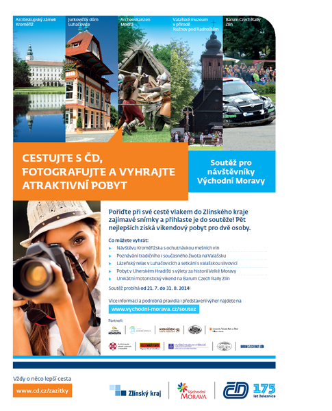 Letní měsíce jsou ideálním časem pro výlety a dovolenou. V letošním roce jsme pro vás připravili letní fotografickou soutěž. Zašlete nám v době od 21. července do 31. srpna 2014 fotku z výletu či dovolené na Východní Moravě (Zlínský kraj), na kterou jste cestovali vlakem. Pokud se vám podaří jedinečná fotka, neváhejte a přihlaste ji do letní fotografické soutěže S Českými drahami na Východní Moravu. Snímky z výletu vlakem či dovolené, na níž jste přijeli po kolejích, pořízené v regionu Východní Morava (Zlínském kraji) zasílejte od 21. července do 31. srpna 2014 na e-mailovou adresu info@vychodni-morava.cz. Pravidla soutěže najdete zde. Pět nejvydařenějších fotek bude odbornou porotou odměněno víkendovým pobytem pro dvě osoby na Východní Moravě a volnou vstupenkou do turistického cíle Východní Moravy.