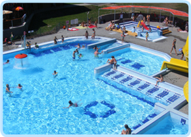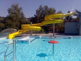 Tobogán je jeden, je vysoký a přitom velmi bezpečný, celá dráha má zvýšené okraje. Voda je poměrně chladná (24 C), což je příjemné v parních dnech. Dále je tam vodní hřib, plavecké dráhy, vodní děla, masážní lůžka, dvě skluzavky, spousta trávy nebo laviček na opalování, průzračná voda a především klid, málo lidí. Ve sprchách je teplá voda, ale musí se nejprve odpustit. Atrakce jsou zahrnuty v ceně. Nově vybudovaný menší bazén a beach volejbalové hřiště.