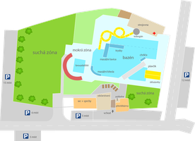 Koupaliště má jeden bazén, kde jsou plavecké dráhy a zároveň také všechny vodní atrakce: tobogán, skluzavky, masážní lavice, malý bazén pro ty nejmenší a také vodní trysky. V areálu je také občerstvení a zcela nové zázemí a šatny.