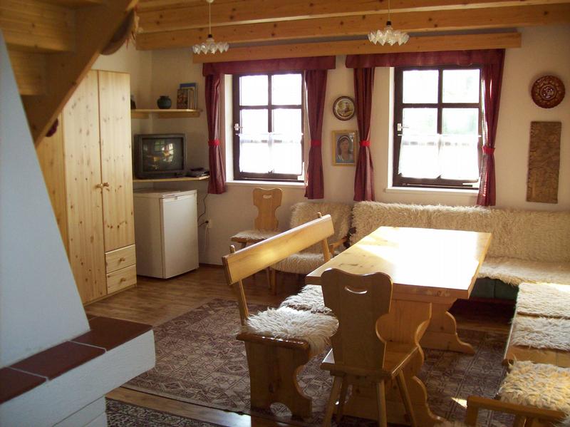 Valašská jizba s krbem a dvěmi podkrovními ložnicemi.