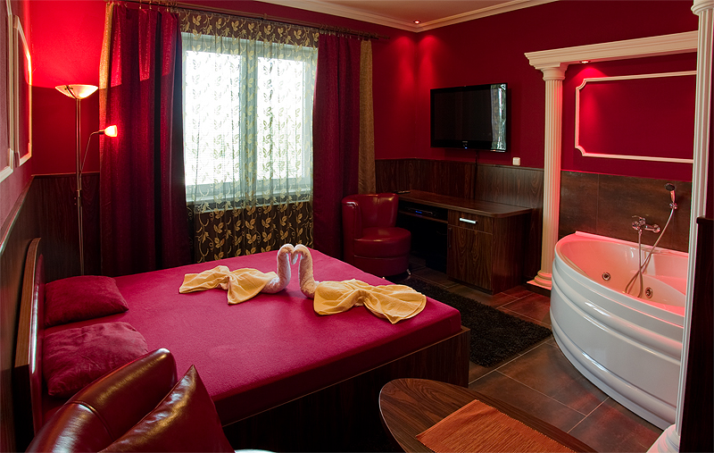 Pokoj je vybaven sociálním zařízením, vířivou rohovou vanou, wi-fi, 42-palcovou TV plazmou, DVD a nabídkou erotických kanálů. Jako dárek od nás obdržíte láhev šampaňského.