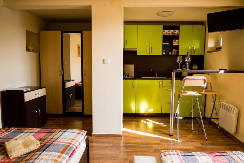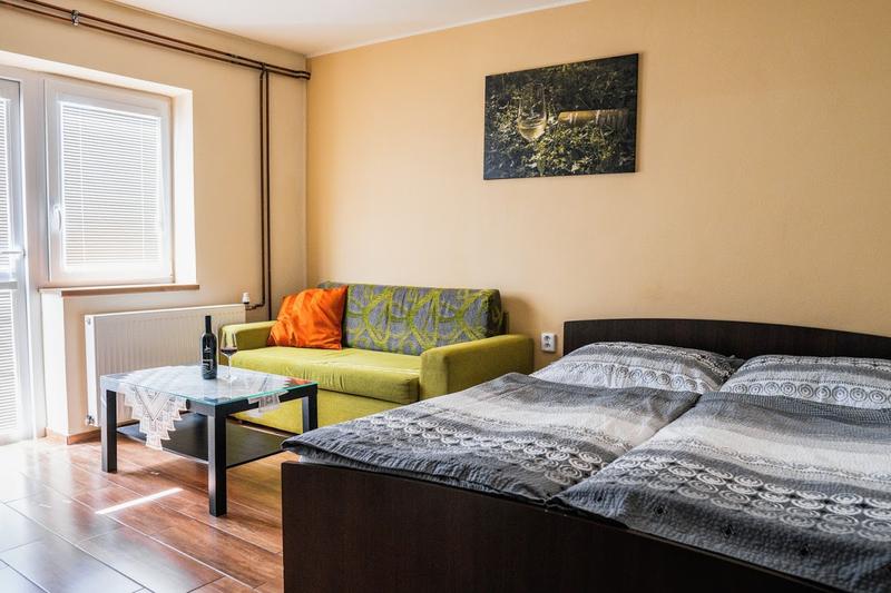 Nárazově máme k dispozici apartmán do sedmi lidí v Kulturním domě (o 150 metrů níže), vhodný pro bandu kamarádů na přespání po náročné akci ve sklepě.