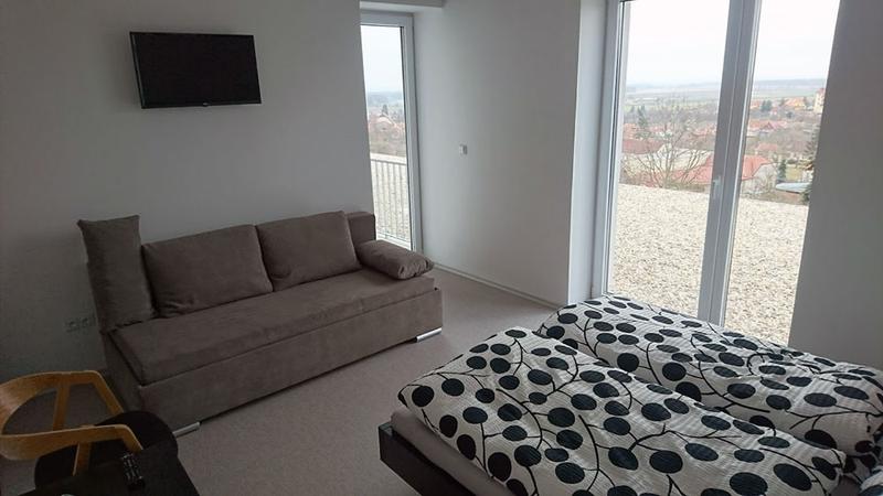 Penzion se nachází v centru obce na ulici Vinařská, přímo naproti vinných sklepů Vinařství Vaďura. Kapacita: 11 lůžek - 3 dvoulůžkové pokoje (2 s možností 2 přistýlek, 1 pokoj s 1 přistýlkou). Pokoje mají balkón s výhledem na Polešovice, Dolnomoravský úval a Bílé Karpaty. Každý pokoj má kompletně vybavenou kuchyňku vč. nádobí a spotřebičů a vlastní sociální zařízení ( sprcha, WC). V každém pokoji je LED TV a klimatizace, samozřejmostí je bezplatná WIFI. V přízemí penzionu můžete využít společenskou místnost.